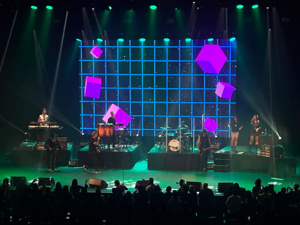 Uno de los momentos más memorables de la noche fue un solo de guitarra que dio paso a “Un camino hasta vos”, acompañado de una impactante animación en pantalla con cubos en 3D al más puro estilo ochentero.